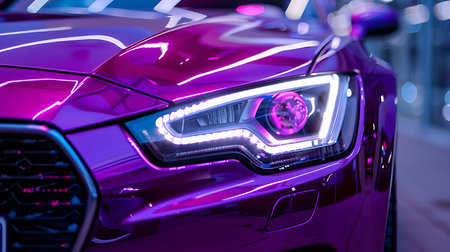 Macro view of car headlight of modern purple car