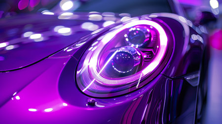 Close up of headlight of a purple sport car with red lights