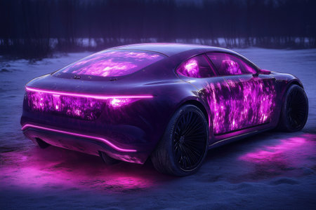 Cyberpunk car glowing in dark city street