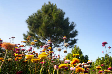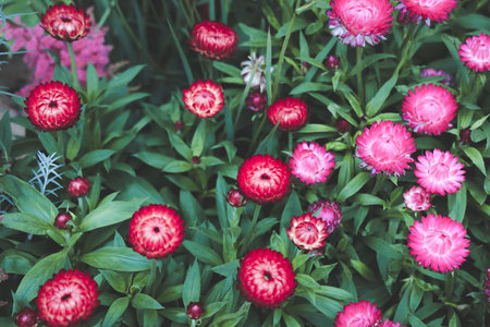 Many colorful Straw flowers are planted lined up beautifully.