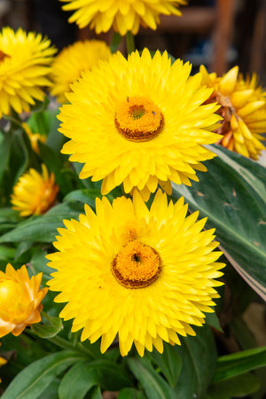 Yellow helichrysum paper daisy straw flower. Helichrysum or Straw flower in outdoor garden. Yellow straw flowers, scientific name is Helichrysum bracteatum.