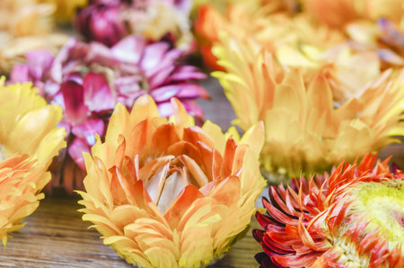 The Dried straw flower heads on wooden background.