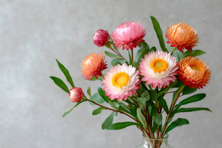Colorful everlasting daisies arranged in a still life against a neutral background