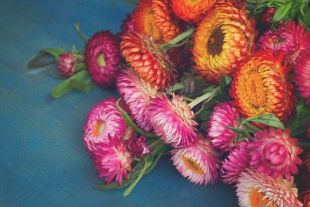 Bouquet of Everlasting flowers bouquet on blue table, retro toned