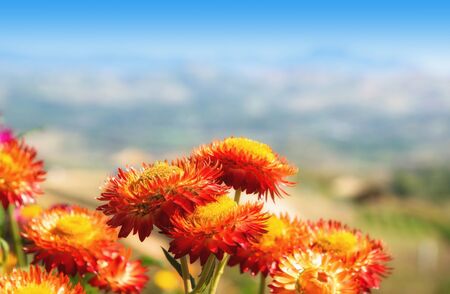 A closeup of straw flower or helichrysum bracteatum flowers on blurred background. Selective focus