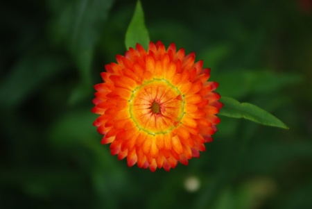 Orange strawflower looking up on blurred leafy background