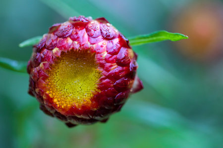 Red strawflower with yellow center that is newly opened with green background