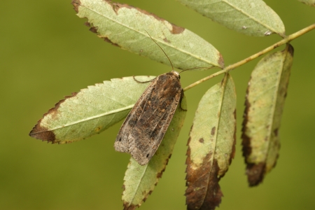 Closeup on the Dark Arches moth, Apamea monoglypha sitting on a green leaf in the garden