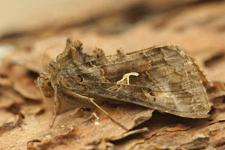 Full nody close up of the Silver Y moth, Autographa gamma on a piece of bark in the garden