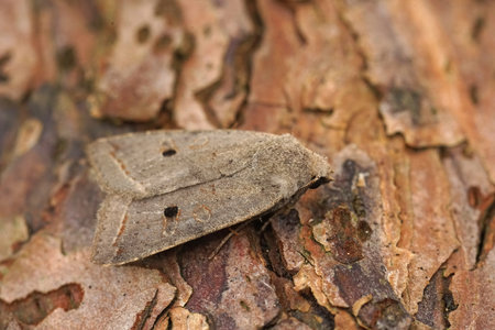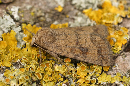 Detailed closeup on a True Lover's Knot moth, Lycophotia porphyrea, sitting on lichen covered wood in the field