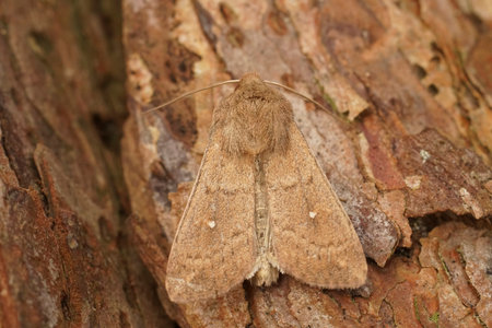 Detailed closeup on the orange brown colored Clay owlet moth , Mythimna ferrago sitting on wood