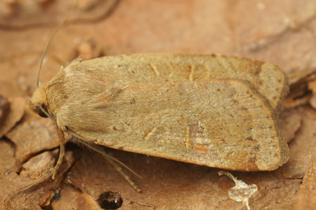 Closeup on the lightbrown obscure wainscot owlet moth, Leucania obsoleta , sitting on a piece of wood in the garden