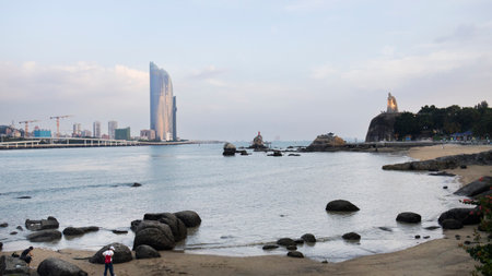 Viewpoint seascape and landscape stone beach of Lujiang river and cityscape Gulangyu Island or Town of Pianos with Koxinga statue facing Twin Tower Xiamen Shimao Cross-strait Plaza in Fujian, China
