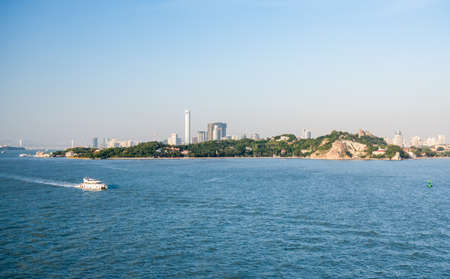 Ferry boat passes island of Gulangyu in foreground with background of Xiamen in China