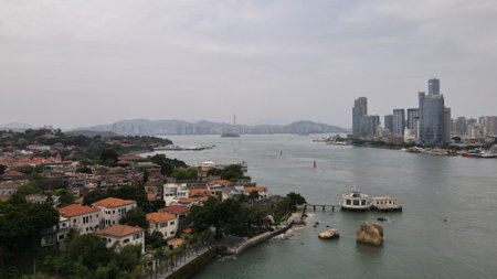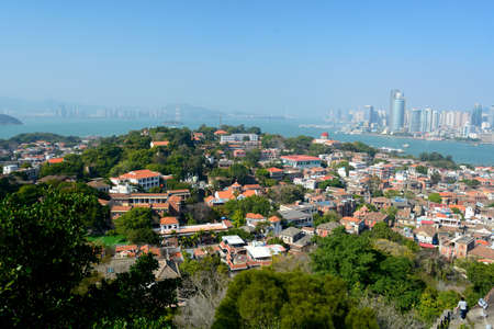 Xiamen city viewed from Gulangyu island in Fujian, China.