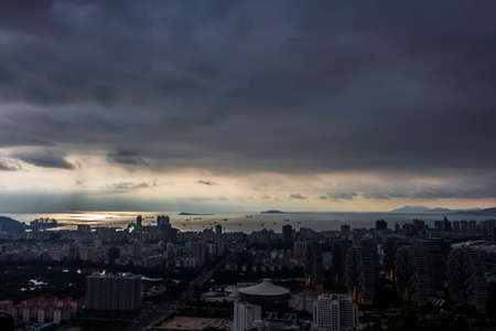 a bird's eye view of the beautiful coastal city in xiamen at dusk