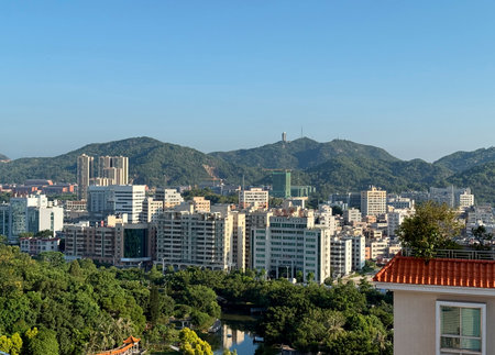 In the morning, the southern city of China is bathed in sunshine, with undulating mountains, dense forests, crowded buildings and clear pool water, a city waking up.