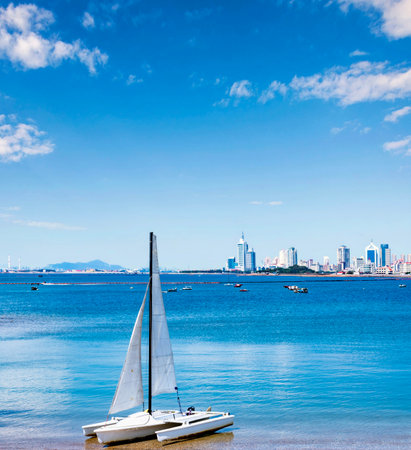Sailboat in the sea with blue sky and cityscape background