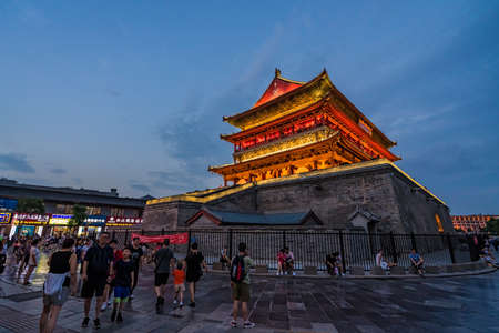 Xian, China - July 2019 : Tourists walking in front of the Bell Drum Tower beautifully lit and illuminated at night, Shaaxi Province, Central China