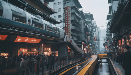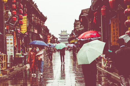 PINGYAO, CHINA - MAY 21, 2018: Tourists and local people in the ancient city of Pingyao in central China, Asia. Rainy weather.