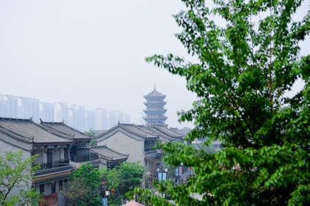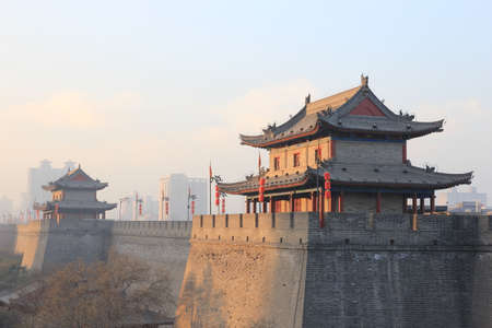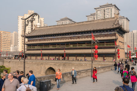 Xian, China - October 16, 2013: View with tourists on the West Gate of Xian City Wall ,one of the oldest and best preserved Chinese city walls in Xian of Shaanxi Province, China. Misty day.