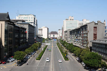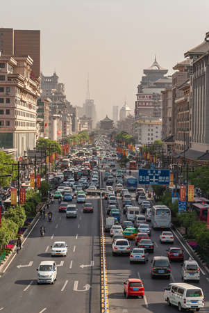 Xian, China - April 30, 2010: Downtown view. Heavy car traffc on North Street at intersection with West and Tangfang streets. Historic building on horizon. Canyoin of buildings with colorful banners.
