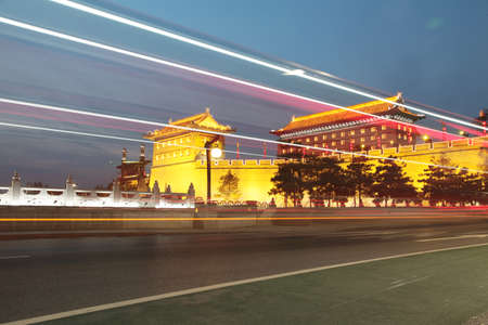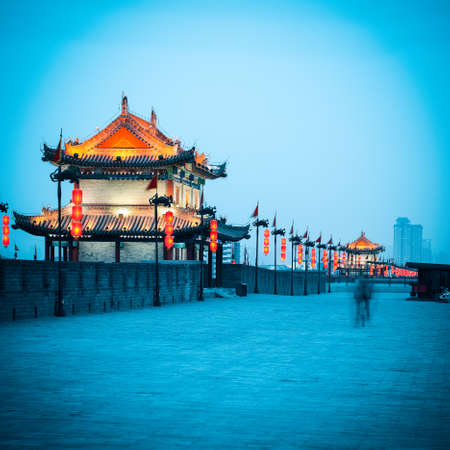beautiful gate tower on ancient city wall at dusk in xian,China