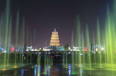 beautiful music fountain with giant wild goose pagoda at night in xian,China