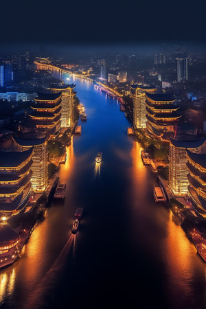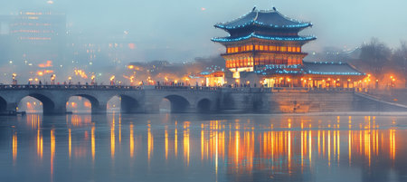 Tranquil Evening Scene, Misty Cityscape with Traditional Korean Architecture Lit Up on River Bank