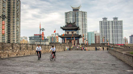 Xian, Shaanxi Province / China - August 4, 2015: People ride bicycles on top of the Xian City Walls largest and best preserved old city walls in China