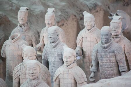 Xian, China - July 2019 : Standing clay soldiers forming part of an army of terracota warriors, created during the reign of first chinese emperor Qin Shi Huang Di, Shaanxi Province