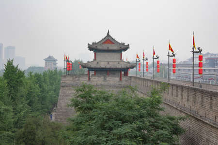 Xian, China - May 1, 2010: North Gate of Huancheng City Wall. View of east side ramparts with towers and people under silver smoggy sky. Red decorations all the way. Some green foliage.