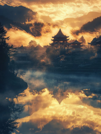 Golden hues illuminate the landscape as mist rises over still waters, reflecting ancient buildings nestled in the mountains at dawn.