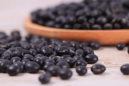 Black turtle beans on bright surface with copy space. Shallow depth of field.