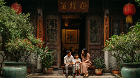Unidentified Chinese family sitting in front of the entrance to a Chinese temple in Hong Kong.
