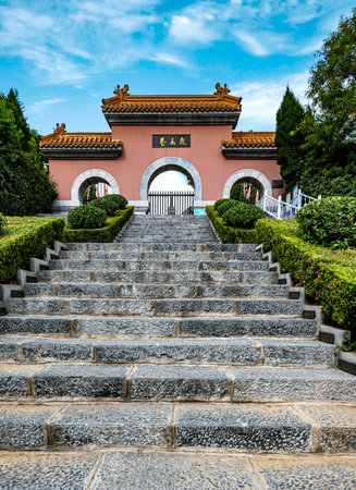 Beijing, China - April 28, 2010: Ming Dynasty Tombs domain, or Ming Changling. Large orange-roofed, red entrance Stele hall and gate under blue sky and with green vegetation and two white ornamental pillars.