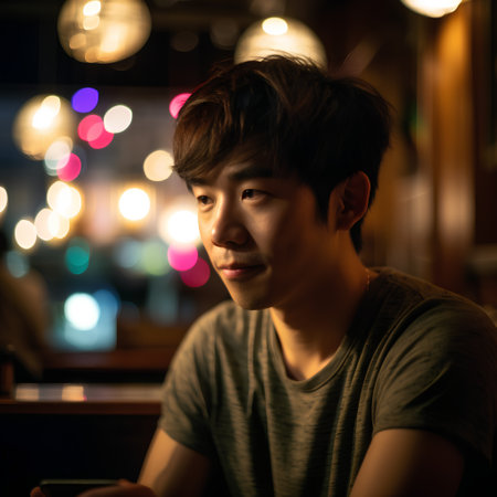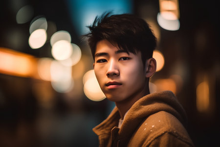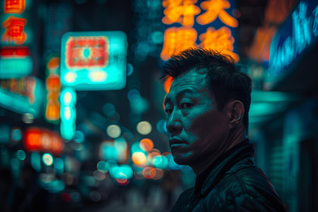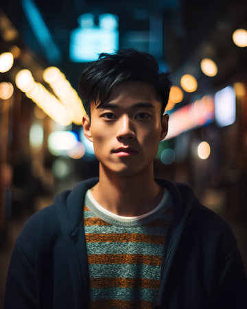 A confident young asian man stands in the busy city, illuminated by glowing lights.