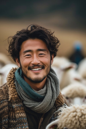 Asian man smiling with sheep in the background, in the style of farm security administration aesthetics