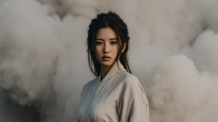Woman poses in a traditional outfit surrounded by smoke. The location appears to be outdoors, with a cloudy background. She looks directly at the camera with a serious expression.