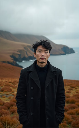 Asian man in black coat, Ochre Hills and Misty Cliffs