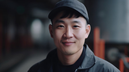 A smiling Chinese male factory worker standing in oil refinery plant. Generative AI AIG19.