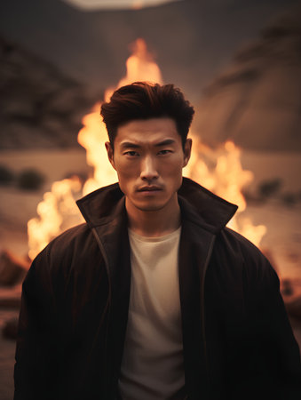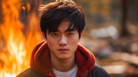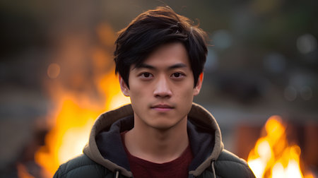portrait of a young asian man in front of a fire