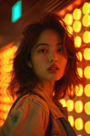 A captivating portrait of a stylish woman, bathed in vibrant neon orange light, embodies modern urban cool Her contemporary fashion and confident gaze radiate against the atmospheric backdrop, creating a striking and dynamic image AI Generative