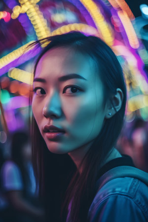 Portrait of young beautiful asian woman in night club with colorful lights.