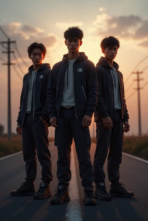 Group of Asian teenagers standing on the road at sunset time.