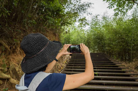 woman take a picture when hiking at outdoor