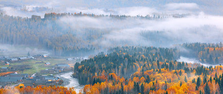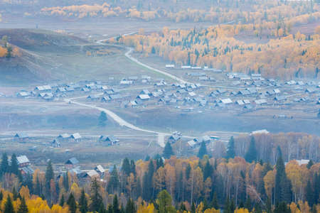 aerial view of hemu village in autumn, Kanas, Xinjiang