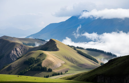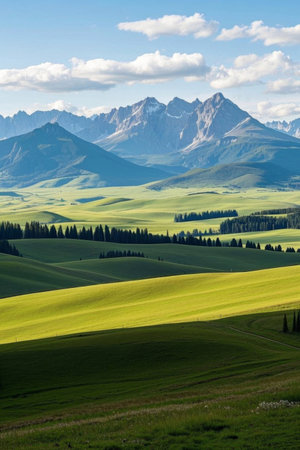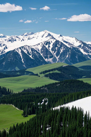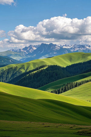 Grassland and mountains in a sunny day. Shot in Xinjiang, China.
