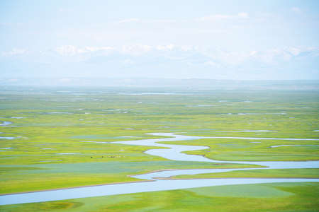 River beds flowing through a green valley with mountains covered with snow on the horizon. Travel Kyrgyzstan.