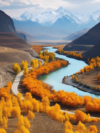 A breathtaking view of a winding river through a golden landscape, bordered by majestic snow-capped mountains under a clear blue sky. Perfect for nature lovers.